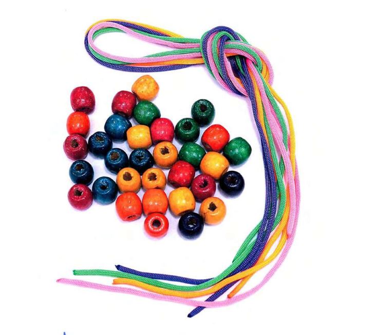 Material: Wood Approximate Dimension: dia 25 mm with 3 mm dia hole through with 1 meter lace, Color: Multi Quantity: 35 no.'s