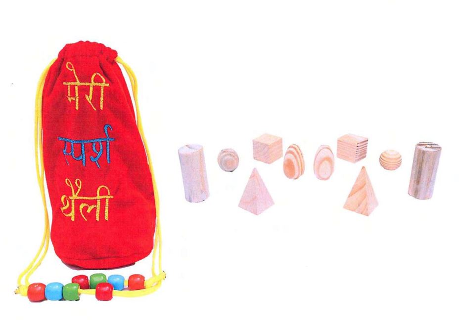 Material: Cloth 0 String Bag made from Red Falali cloth with yellow & blue color embroidery and locking facility in 5 different wooden shapes. Approximate Dimension: Bag - Base dia 150 mm and height 250 mm (Qty. 1 no.) Cylinder Outer dia 34 mm, height 65 mm (Qty. 2 no.) Cube with sides 34 mm (Qty. 2 no.) Oval (Ovoid) dia 34 mm, length 55 mm (Qty. 2 no.) Sphere dia 34 mm (Qty. 2 no.) Pyramid base 33 mm, height 53 mm (Qty. 2 no.) Quantity: As per above mentioned no.'s